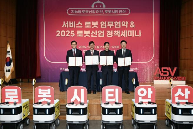 이날 정책세미나와 함께 ‘로봇기업 업무협약’ 체결식이 진행됐다. 이민근 안산시장과 김병수 로보티즈 대표이사, 이기정 한양대학교 총장, 정진수 경기테크노파크 원장이 공동 체결한 이번 협약은 한양대학교 ERICA를 중심으로 로보티즈 자회사 로보티즈 AI의 자율주행 배달로봇 ‘개미’를 이용해 국내 최초로 캠퍼스형 배달로봇 서비스 도입에 관한 추진 사항을 담고 있다.