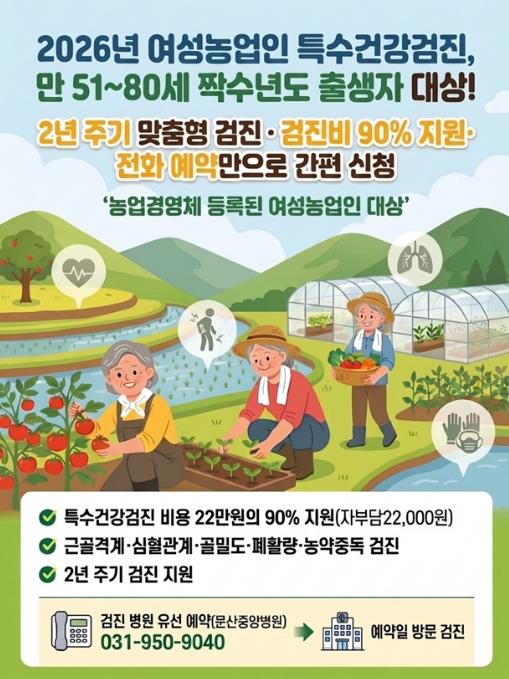 ‘여성농업인 특수건강검진 지원사업’은 농작업으로 인한 근골격계 질환과 만성질환을 조기에 예방하기 위해 여성농업인 맞춤형 건강검진을 2년 주기로 지원하는 사업으로 2025년도에는 251명이 검진을 지원받았으며, 2026년도에는 564명으로 지원 규모가 확대된다.