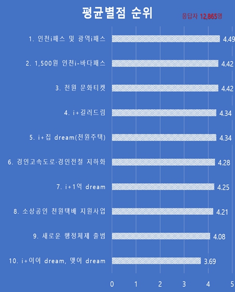 설문은 인천시가 추진 중인 10대 주요 사업에 대해 5점 만점의 별점 평가 방식으로 진행됐으며, 전반적으로 높은 점수를 받았다.