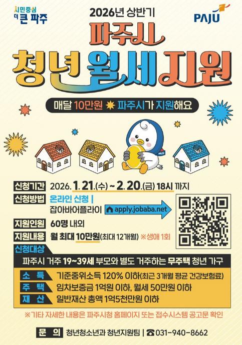 [무한뉴스=정승훈 기자] 파주시는 주거비 부담으로 어려움을 겪고 있는 19~39세 청년 가구를 대상으로 월 최대 10만 원씩 최대 12개월간, 총 120만 원의 월세를 지원한다.