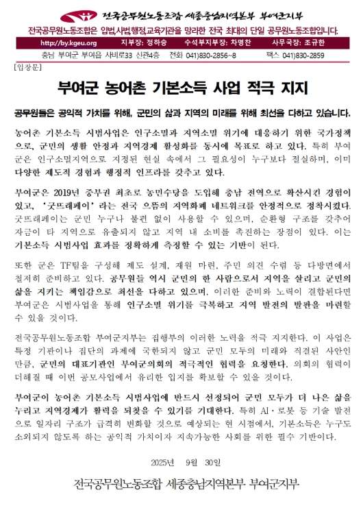 [무한뉴스=정민정 기자] 전국공무원노동조합 부여군지부는 지난 9월 30일 의견문을 통해, 부여군이 추진 중인 농어촌 기본소득 시범 사업을 적극적으로 지지하며, 군민과 함께 공모사업 유치에 최선을 다하겠다는 뜻을 밝혔다.