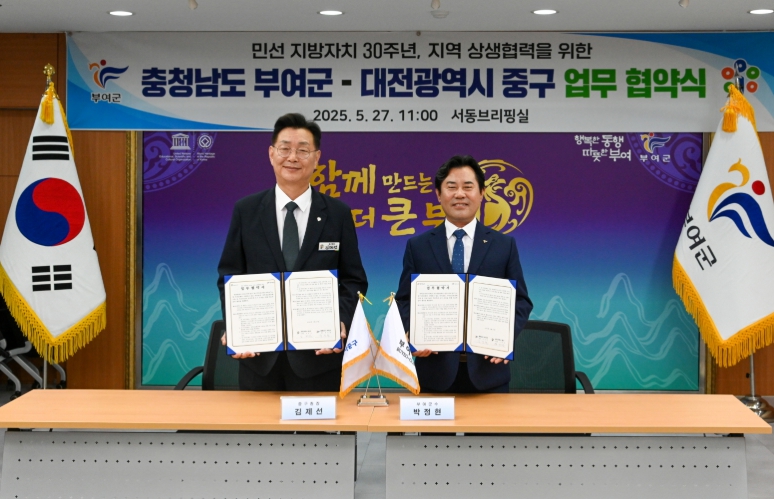 [무한뉴스=정민정 기자] 부여군과 대전광역시 중구가 지난 27일 부여군청 서동브리핑실에서 민선 지방자치 30주년을 맞아 공동 지역발전 전략 추진을 위한 업무협약을 체결했다.