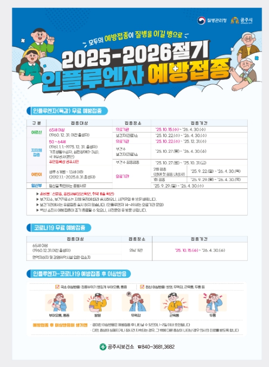 이와 함께 공주시보건소 본소는 10월 27일부터 10월 31일까지, 이인, 탄천, 의당, 사곡, 신풍보건지소 및 각 진료소는 10월 22일부터 백신 소진 시까지 무료 예방접종을 실시한다.