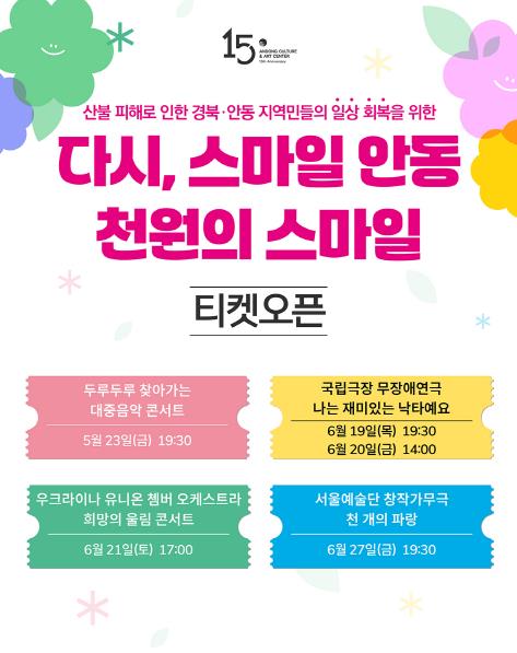 해당 공연들은 이번 산불로 피해를 입은 지역민들을 위로하고 공연 문화예술을 통해 상처를 회복하길 기원하는 의미에서, 또 안동을 방문해 저렴한 공연 관람 및 관광으로 지역 경제 활성화에 도움을 주는 ‘관광기부’의 활성화를 위해, 더 많은 관객이 부담 없이 공연장을 찾을 수 있도록 전석 1천 원으로 티켓을 판매한다.