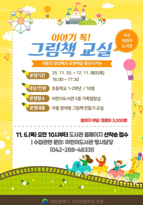 [무한뉴스=정민정 기자] 대전 서구어린이도서관은 오는 6일부터 관내 초등학교 아동을 대상으로‘이야기 톡! 그림책 교실’ 참가 신청을 받는다.