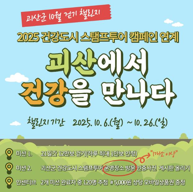 [무한뉴스=정민정 기자] 충북 괴산군보건소는 한국건강증진개발원이 주관하는 ‘2025 건강도시 스탬프투어 캠페인’과 연계해 ‘괴산에서 건강을 만나다’ 걷기 챌린지를 운영한다고 2일 밝혔다.