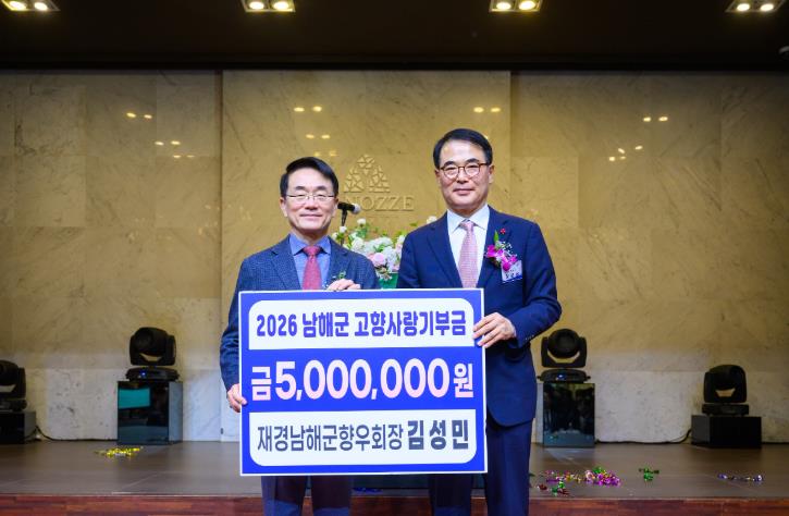 [무한뉴스=최진수 기자] 재경남해군향우회 김성민 회장이 지난 6일 서울에서 열린 ‘2026년 재경향우회 신년하례회’에서 남해군의 발전을 위해 고향사랑기부금 500만 원을 기탁했다.