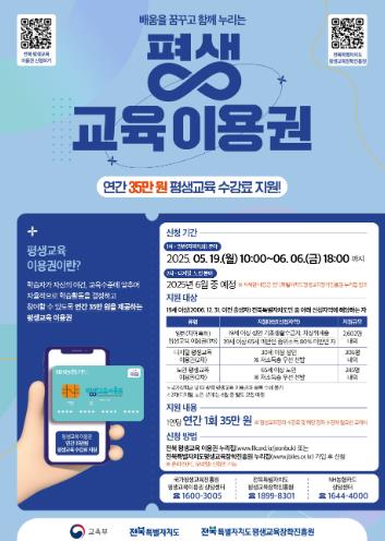 [무한뉴스=정민정 기자] 군산시가 ‘2025 전북특별자치도 평생교육 이용권’ 신청 접수를 6월 6일까지 진행한다고 밝혔다.