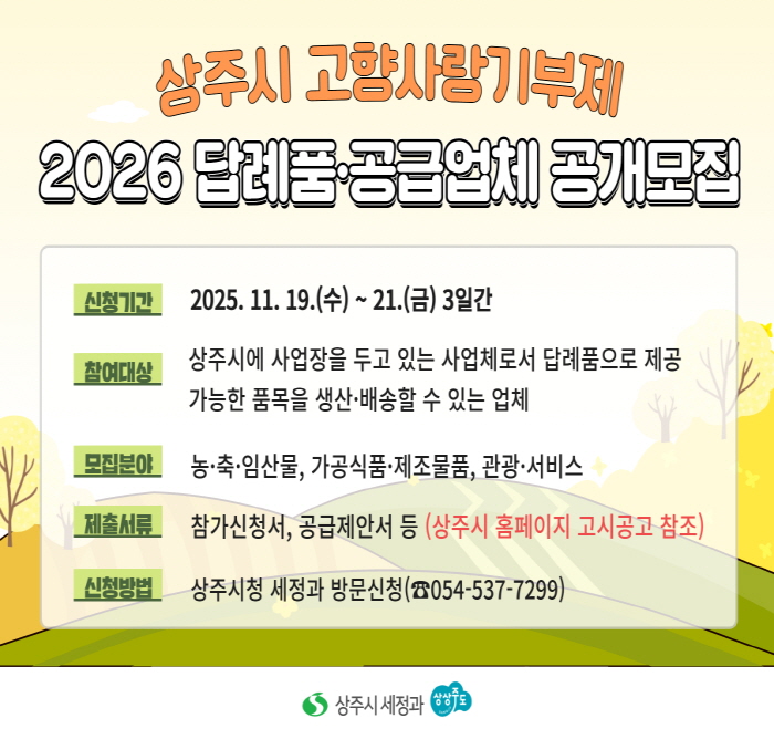 [무한뉴스=최진수 기자] 상주시는 2026년 고향사랑기부제에 참여할 답례품 공급업체를 오는 21일까지 공개모집 한다.