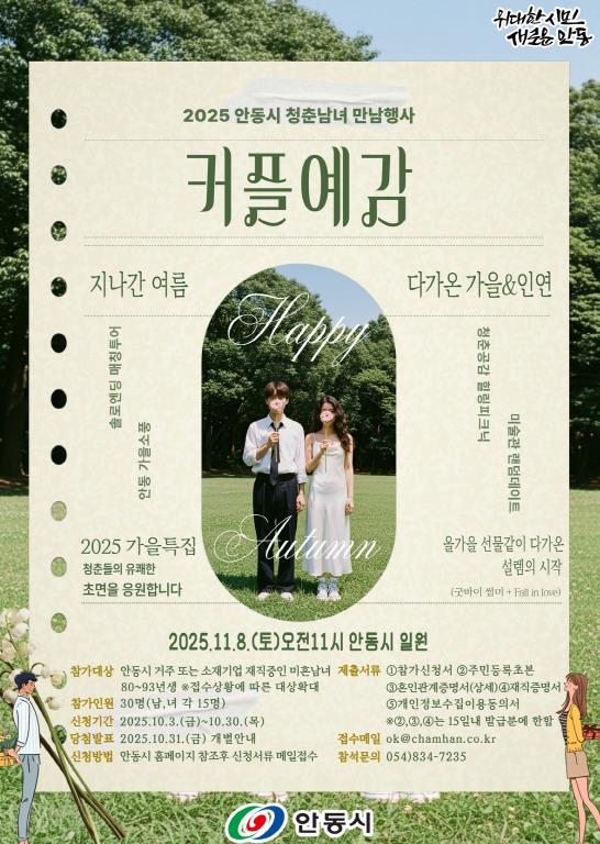 [무한뉴스=최진수 기자] 안동시가 청춘남녀의 건강한 만남을 지원하기 위해 마련한 ‘2025 커플예감! 힐링피크닉’ 시즌4 참가 신청을 10월 30일까지 접수한다.