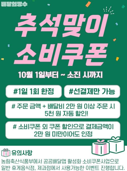 농림축산식품부는 10월 1일부터 공공배달앱을 이용해 2만 원 이상 주문할 경우, 매일 1인당 5,000원 상당의 소비쿠폰을 지급하기로 한 것이다.