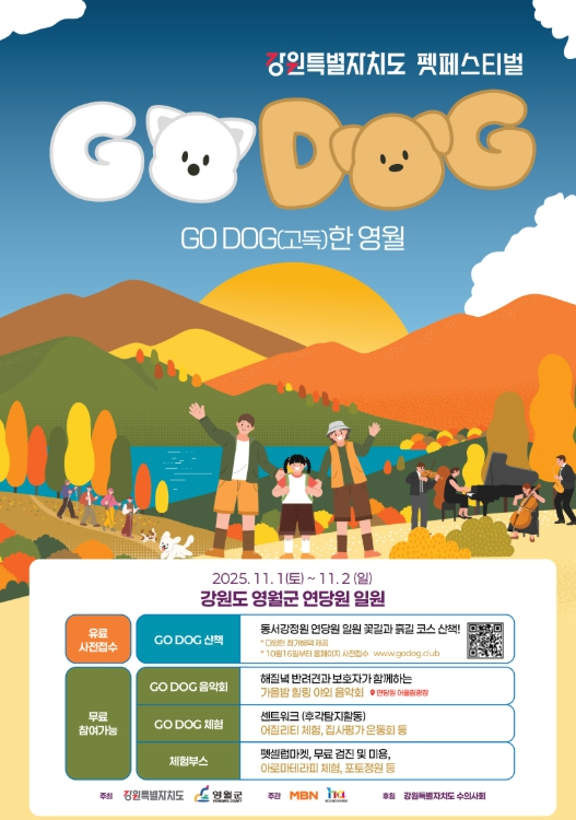 [무한뉴스=정민정 기자] 강원특별자치도와 영월군이 주최하고 MBN과 HA인터렉션이 주관하는 ‘고독(GO DOG)한 영월’ 펫 페스티벌이 11월 1일부터 11월 2일까지 동서강정원 연당원에서 열린다.