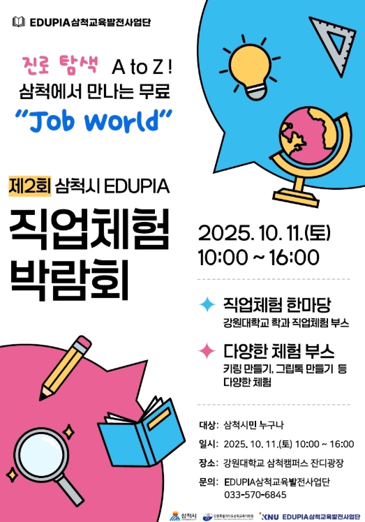[무한뉴스=정민정 기자] 삼척시와 EDUPIA삼척교육발전사업단은 오는 10월 11일 오전 10시 강원대학교 삼척캠퍼스 잔디광장에서 ‘제2회 삼척시 EDUPIA 직업체험 박람회’를 개최한다고 밝혔다.