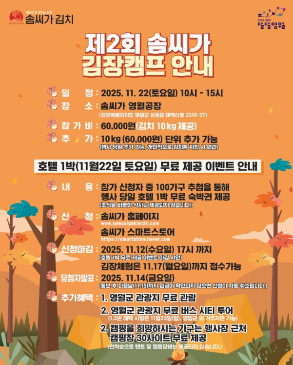 [무한뉴스=정민정 기자] 영월군 상동읍의 청정 지역 김치 브랜드인 농업회사법인 솜씨가는 오는 11월 22일 토요일 오전 9시부터 오후 6시까지 제2회 솜씨가 김장캠프를 개최한다.