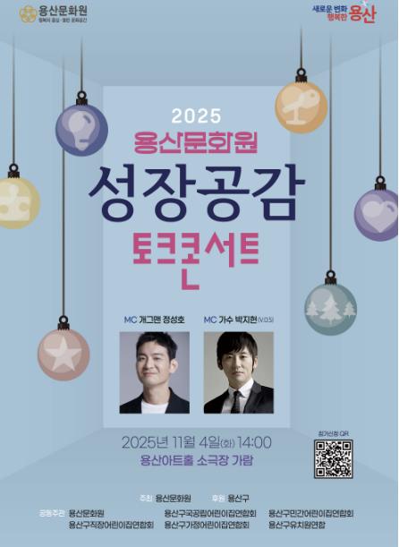 [무한뉴스=정승훈 기자] 서울 용산구는 오는 11월 4일 오후 2시, 용산아트홀(녹사평대로 150) 소극장 가람에서 ‘성장공감 토크콘서트’를 개최한다. 이번 행사는 용산문화원이 주관하고 용산구가 후원한다.