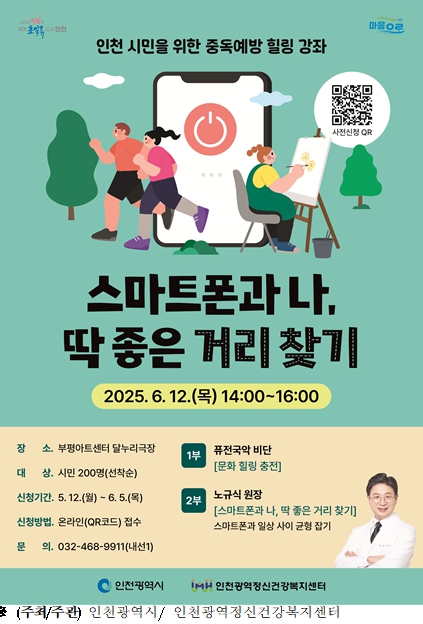 [무한뉴스=정승훈 기자] 인천광역시는 스마트폰이 일상이 된 현대 사회에서 그 편리함만큼이나 중독과 거리 조절에 대한 고민도 커지고 있는 가운데, 시민들의 중독예방을 돕기 위한 문화공연과 전문가 강연이 어우러진 힐링 강좌를 마련했다.