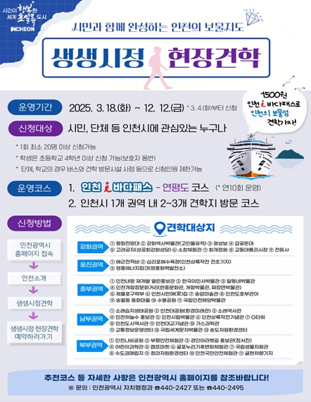 ‘생생시정 현장견학’은 인천시정에 관심 있는 초등학교 4학년 이상 학생부터 일반 시민, 단체는 물론 타 시도 주민까지 20인 이상이면 누구나 무료로 참여할 수 있다.