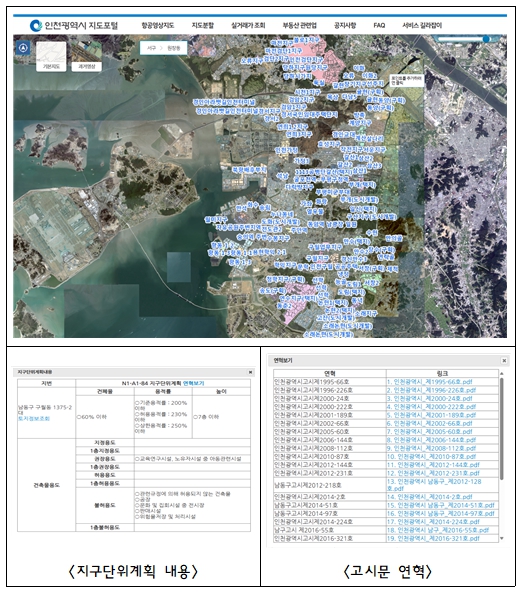 시민은 인천시 지도포털에 접속해 주소 입력 또는 위치 선택만으로 해당 토지의 지번, 지목, 면적 등 기본정보와 함께 지구단위계획구역, 건축물 용도, 건폐율, 용적률, 높이 등 세부정보를 한눈에 확인할 수 있다. 또한, 각 구역별 고시문 다운로드 기능도 제공된다.