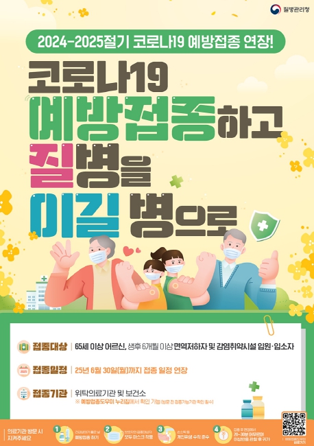 2024-2025절기 인플루엔자 예방접종은 이달 말로 종료되고, 코로나19 예방접종은 6월 30일까지 65세 이상 고령층과 생후 6개월 이상 면역저하자 및 감염취약시설 입원·입소자를 대상으로 연장 실시한다.