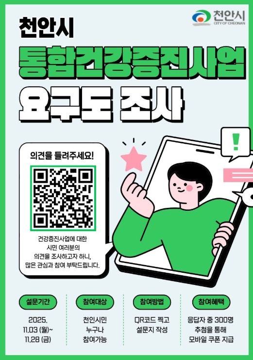 [무한뉴스=정민정 기자] 천안시는 오는 28일까지 내년 지역사회 통합건강증진사업 추진을 위한 주민요구도 조사를 실시한다고 6일 밝혔다.