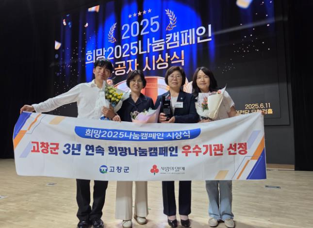 [무한뉴스=정민정 기자] 고창군이 전북사회복지공동모금회가 주관하는 ‘희망2025나눔캠페인’에서 3년 연속 우수시군으로 선정되어 표창패를 수상했다.