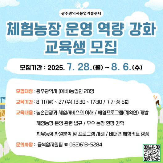 [무한뉴스=정민정 기자] 광주광역시 농업기술센터는 체험농장 운영자의 기획력과 실행력을 높이고 농촌융복합산업을 활성화하기 위해 ‘2025년 체험농장 운영 역량강화 교육’ 참가자를 모집한다.