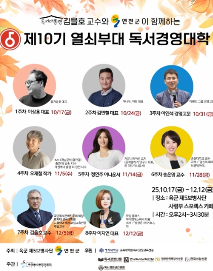 [무한뉴스=정승훈 기자] 연천군과 육군 제5보병사단은 장병들의 지적 성장과 건전한 병영 독서문화 확산을 위한 '열쇠부대 독서경영대학' 제10기 개강식을 오는 10월 17일 개최한다. 이 프로그램은 2023년부터 전국 최초로 민·관·군 협력 독서교육으로 시작됐으며, 매 기수 약 50여 명의 군장병이 수료하며 꾸준한 호응을 얻고 있다.