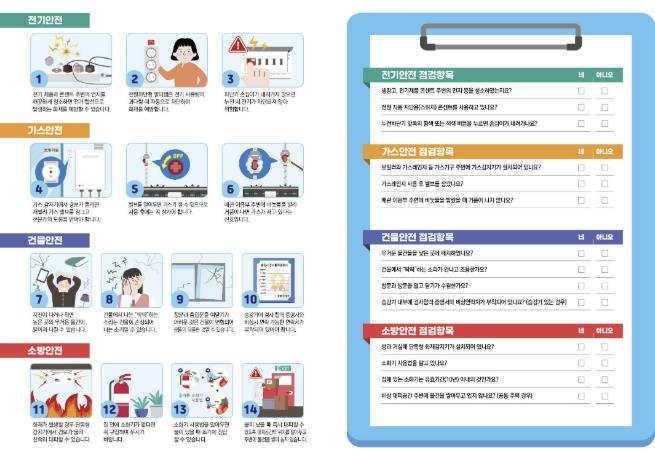 전덕주 행정안전교육국장은 “사소한 부주의가 모여 큰 재난으로 이어질 수 있는 만큼, 자율안전점검은 재난 예방의 첫걸음이자 기본적인 안전수단”이라며 “자율안전점검표를 통해 시민들이 스스로 안전 위험 요인을 해소할 수 있기를 바란다”고 말했다.