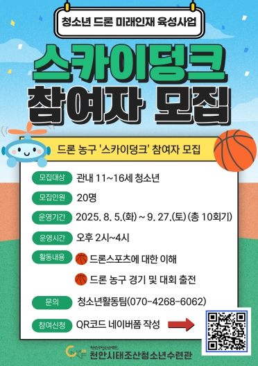 [무한뉴스=최진수 기자] (재)천안시청소년재단 천안시태조산청소년수련관은 드론 농구 프로그램 ‘스카이덩크’를 참가자를 모집한다고 30일 밝혔다.