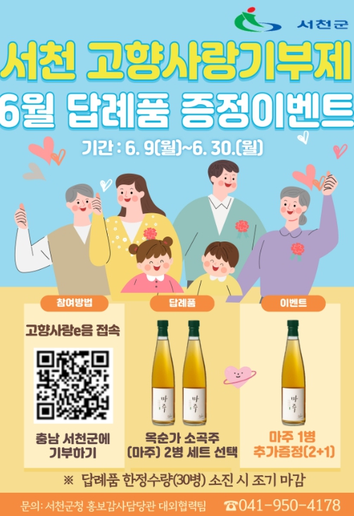 이충희 홍보감사담당관은 “이번 이벤트를 통해 고향사랑기부제 참여자들이 세액공제 혜택은 물론, 서천의 대표 전통주인 한산 소곡주를 답례품으로 받아볼 수 있길 바란다”며 많은 관심과 참여를 당부했다.