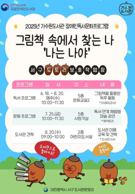 [무한뉴스=정민정 기자] 대전 서구 가수원도서관은 관내 장애인복지시설 ‘도토리보호작업장’소속 장애인들을 대상으로 이달 18일에서 8월 20일까지 장애인 독서 문화 프로그램 ‘그림책 세상 속에서 찾는 나, 나는 나야’를 운영한다.