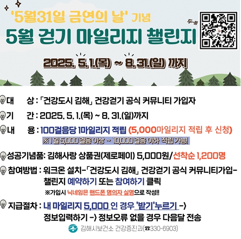 비대면 걷기 앱인 워크온 내 ‘[건강도시 김해] 건강걷기 공식 커뮤니티’ 가입자 수가 현재 16,013명으로 경상남도 내 가장 많으며, 2024년에는 걷기 챌린지를 14회 실시하여 총 25,525명의 시민 참여를 이끌어냈다.