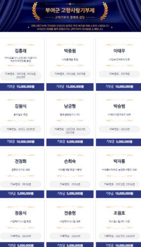 부여군청 누리집의 군정소식'고향사랑기부제'고향사랑 명예의 전당에 기부자 명단을 게시하고 있다.