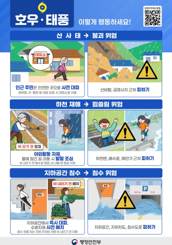 집중호우 시 행동 요령으로 ▲상습 침수지역, 산사태 위험지역은 피하고 안전한 곳으로 대피 ▲비 내리기 전 배수로 점검 ▲ 야외활동 자제 ▲하천변, 배수로, 해변가 등 침수 위험지역 접근금지 ▲TV, 라디오, 인터넷을 통해 기상 상황 수시로 확인 등이다.