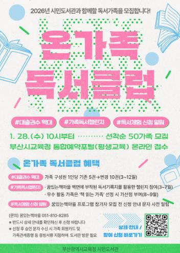 [무한뉴스=최진수 기자] 부산광역시립시민도서관은 오는 28일부터 영·유아 및 초등학생 자녀를 둔 가족을 대상으로 ‘온가족 독서클럽’ 참여 가족 50팀을 모집한다.