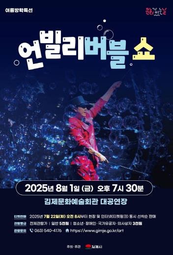 [무한뉴스=정민정 기자] 올여름 전 세계 100개 도시에서 감동을 선사하고, 온 가족이 함께 즐길 수 있는 특별한 공연 '언빌리버블 쇼'가 오는 8월 1일 오후 7시 30분 김제문화예술회관 대공연장에서 펼쳐진다.