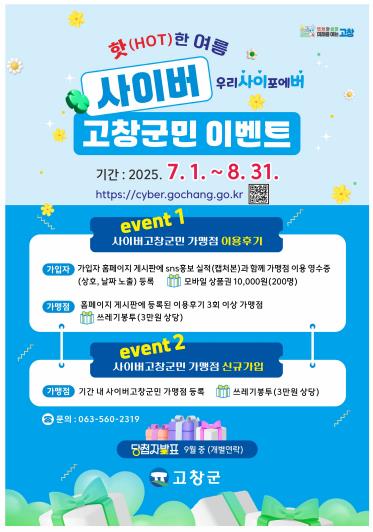 [무한뉴스=정민정 기자] 고창군이 ‘사이버 고창군민’ 제도의 활성화와 가맹점 확대를 위해 오는 8월31일까지 여름 이벤트를 진행한다.