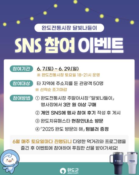 [무한뉴스=정민정 기자] 완도군은 ‘2025 완도 방문의 해’를 맞아 완도전통시장 ‘달빛 나들이’ 참여 인증 이벤트를 진행한다.