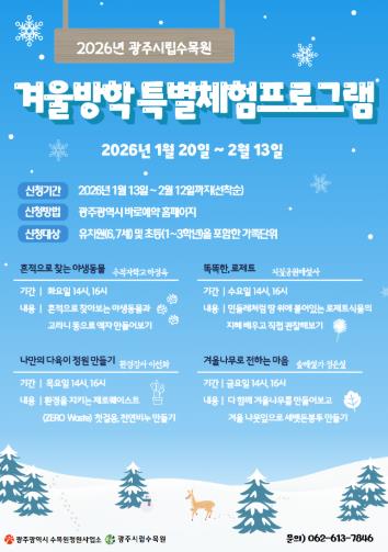 [무한뉴스=정민정 기자] 광주광역시 시립수목원은 어린이를 위한 ‘2026년 겨울방학 체험 프로그램’ 참가자 640명을 오는 13일 오전 10시부터 선착순 모집한다.