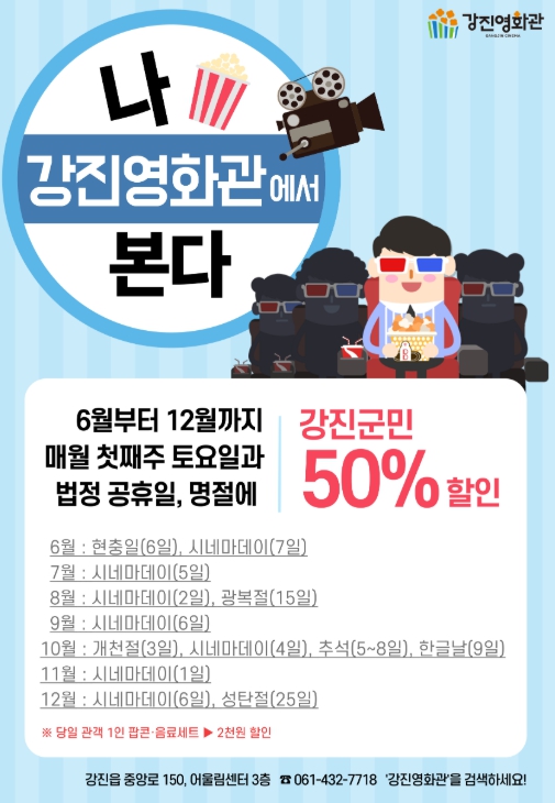 ‘강진 영화보는 날’은 강진군민을 대상으로 영화 관람료 50% 할인 혜택을 제공하는 상설 행사로, 매월 첫째주 토요일과 법정 공휴일·명절에 강진영화관에서 운영된다.