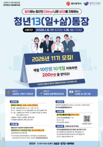 [무한뉴스=정민정 기자] 광주광역시는 일(1)하는 청년의 더 나은 삶(3)을 지원하는 ‘청년13(일+삶)통장’ 제11기 참여자를 8일부터 18일까지 모집한다.