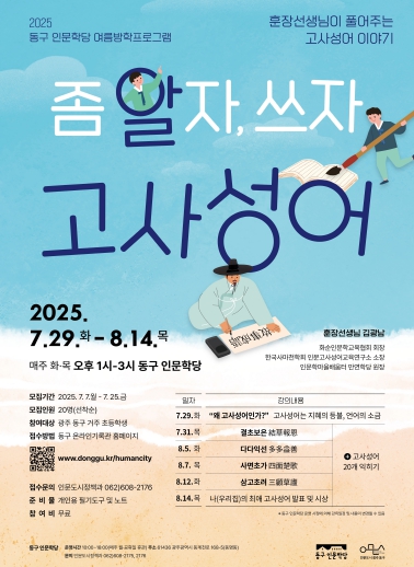 [무한뉴스=정민정 기자] 광주 동구는 오는 25일까지 동구 인문학당 여름방학 프로그램인 ‘좀 알자, 쓰자 고사성어’에 참여할 초등학생을 모집한다고 밝혔다.