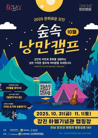 [무한뉴스=정민정 기자] 강진군과 강진군문화관광재단은 2025 문화가 있는 날–구석구석 문화배달 사업의 하나로 ‘캠핑과 함께하는 문화로운 강진’ 2차 행사를 오는 10월 31일부터 11월 1일까지 병영면 하멜 감성텐트촌에서 갖는다.