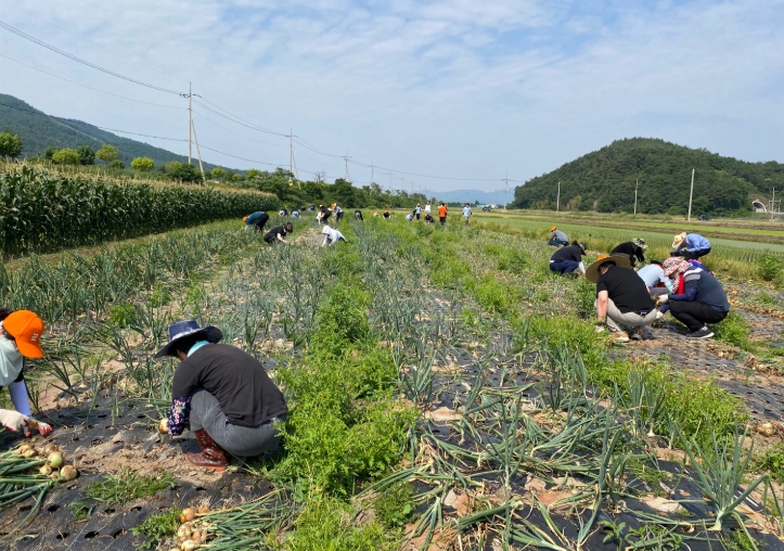 | ▲ 군동면사무소, 세무회계과, 인구정책과 직원 40여명이 양파를 수확하고 있다 |