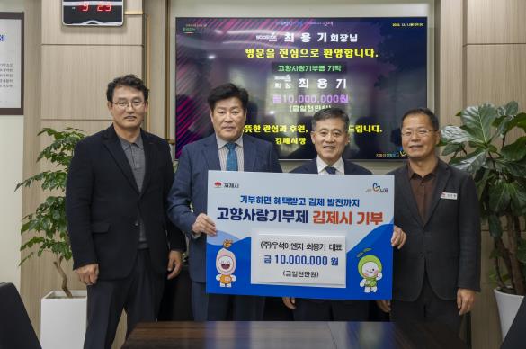 [무한뉴스=정민정 기자] 김제시는 2일 ㈜우석이엔씨 최용기 회장이 김제시 고향사랑기부제에 1,000만원을 기탁했다고 밝혔다.