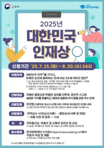 [무한뉴스=정민정 기자] 광주광역시는 오는 8월 20일까지 ‘2025 대한민국 인재상’ 광주 지역 대학생·청년일반인 부문 후보자를 모집한다.