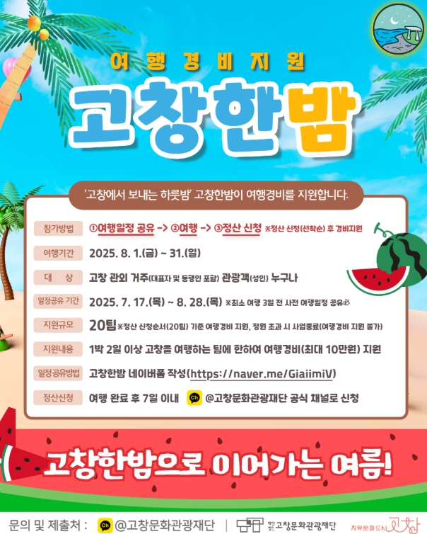 [무한뉴스=정민정 기자] 고창문화관광재단이 운영하는 체류형 관광객 경비지원 프로그램 ‘고창한밤’이 8월에도 여행경비 지원을 이어간다고 18일 밝혔다.