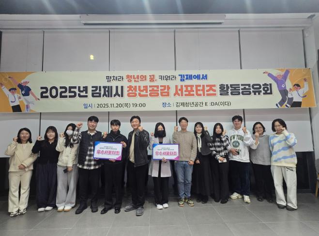 [무한뉴스=정민정 기자] 김제시는 지난 20일, 김제 청년공간 E :DA(이다)에서'2025년 청년 서포터즈 활동공유회'를 개최하고, 올해 서포터즈가 추진한 정책 제안과 다양한 활동을 공유했다고 밝혔다.