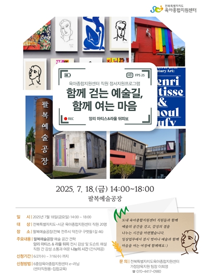 이번 프로그램은 전북특별자치도 육아종합지원센터가 주관하며, 도내 8개 시군 센터에서 20명의 실무자가 참여한다. 참가자들은 팔복예술공장 주요 공간을 둘러보고, ‘앙리 마티스 & 라울 뒤피’ 특별 전시를 관람하며 감성 회복과 창의력 향상의 시간을 갖는다.