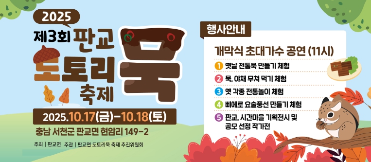 [무한뉴스=정민정 기자] 서천군 판교면은 오는 10월 17일부터 18일까지 이틀간 판교전통시장 일원에서 ‘제3회 판교 도토리묵 축제’를 개최한다.